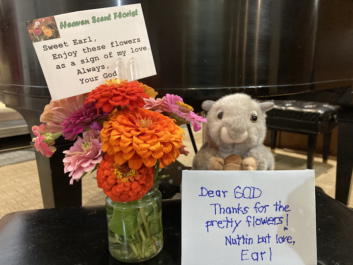 Flowers have been making our gardens beautiful all summer. While they may have come from seeds or garden centers, Earl really knows who sent them to us and is thankful.