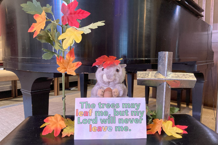 Autumn is the season for leaves falling from the trees. Earl likes to think each leaf represents a blessing that has been given to us and that our Lord is always with us. The cross next to Earl is a replica of one created for Southminster by a talented local artist. Thank you, Steve!